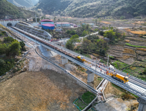 “操作员,放钢轨速度再慢一点,稍微再往上提一点,其他地面人员赶紧跟上,落槽的时候看准咯。”张根全一边盯着钢轨下落的状态,一边拿着对讲机和铺轨作业人员进行联络。在他的指挥下,一根根钢轨精准落入轨槽中。