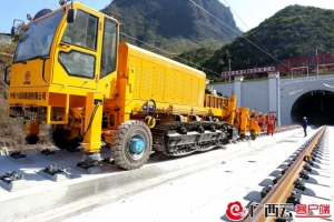 “呜……”,除夕清早,随着铺轨机悠长的汽笛响起,环江的贵南高铁铺轨现场顿时热闹了起来,40多名铺轨施工人员跟随着铺轨机在大山里的道床上缓慢移动,机器的轰鸣声、钢轨的落槽声、工人的呐喊声汇成了一曲高亢激昂的新春劳动进行曲。