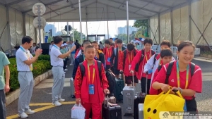10月18日,第一届全国学生(青年)运动会运动员村迎来首批运动员入住。早上8:40,记者在运动员村3号安检通道处看到,现场“欢迎回家”“欢迎回家”的欢呼声此起彼伏,运动员村村委会代表、志愿者正列队迎接广西南宁跳水队一行18人入驻学青会运动员村,至此,运动员村全面进入“学青会模式”。