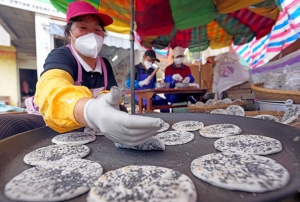 据了解,芝麻饼是邕宁人过年过节的喜庆小吃,用米面做成饼皮,用黄糖和若干种粟米做成饼心,在烧红的铁锅上烙干,撒上芝麻,制作而成。芝麻饼饼面香脆,饼陷清甜,有芝麻香味,深受市民的喜爱。