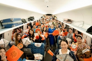 中老铁路项目被誉为“高质量共建‘一带一路’的标志性工程”。2023年4月13日,中老铁路从昆明南站、万象 站双向对开国际旅客列车。越来越多的旅客选择乘坐中老铁路动车跨境旅行。本次列车迎新音乐会邀请到了中老两国的歌手、舞蹈演员、乐手汇聚一堂,共同演绎了《自由之地》 《 一路同行》《新春序曲》《敬酒歌》等多首中老两国名曲,为乘坐列车的旅客们带来了一场音乐盛宴,同时也送上新春美好的祝福。