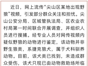 经专业人员对网传视频内疑似野狼的动物进行鉴定,该动物并非野生狼类,系捷克狼犬,属于犬科驯养动物。目前,该犬类已找到,未造成群众受伤,该犬只现已由动物救助场所临时收容。
