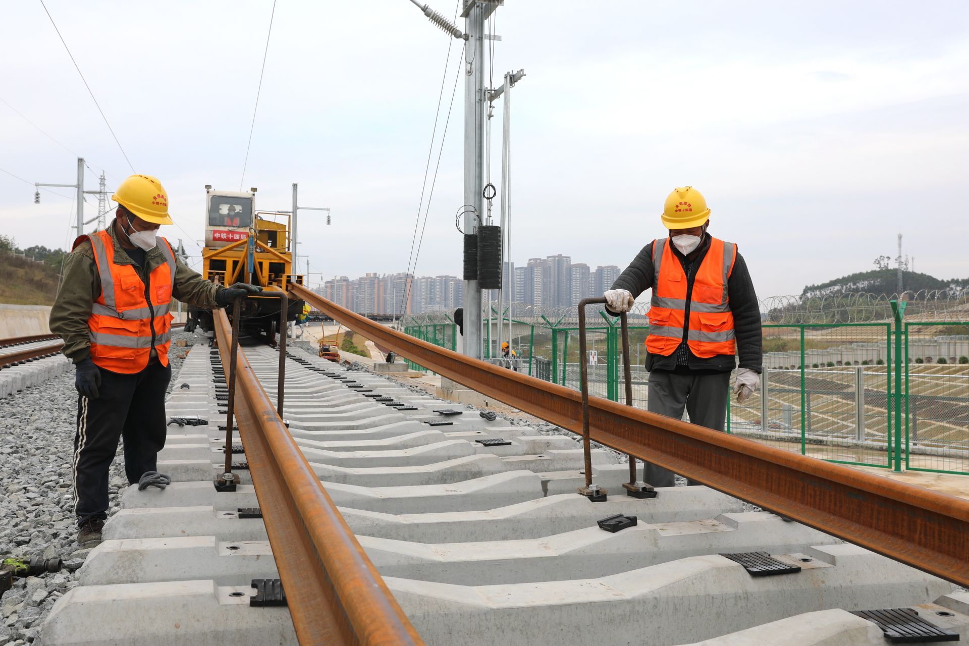 扫码看更多贵南高铁广西段顺利完成铺轨为确保线路今年运营奠定坚实基础。图为工人进行铺轨作业 通讯员 邢星 摄