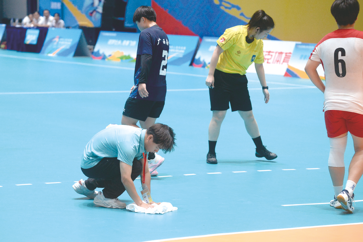 志愿者擦拭比赛场地,确保比赛顺利进行。记者 庞丽娜 摄